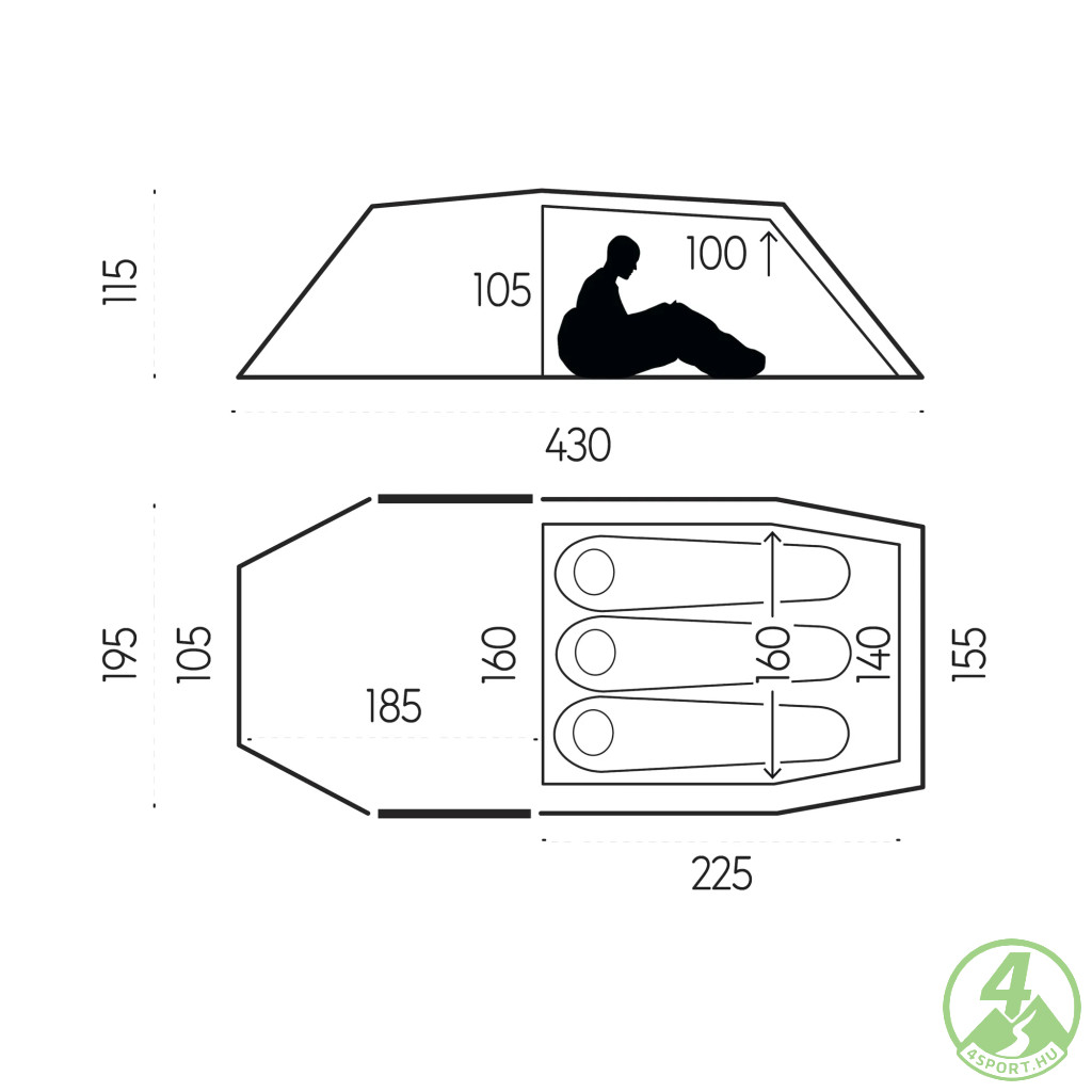 - Szerkezet: külső és belső sátor összekapcsolt, együtt állítható rendszer