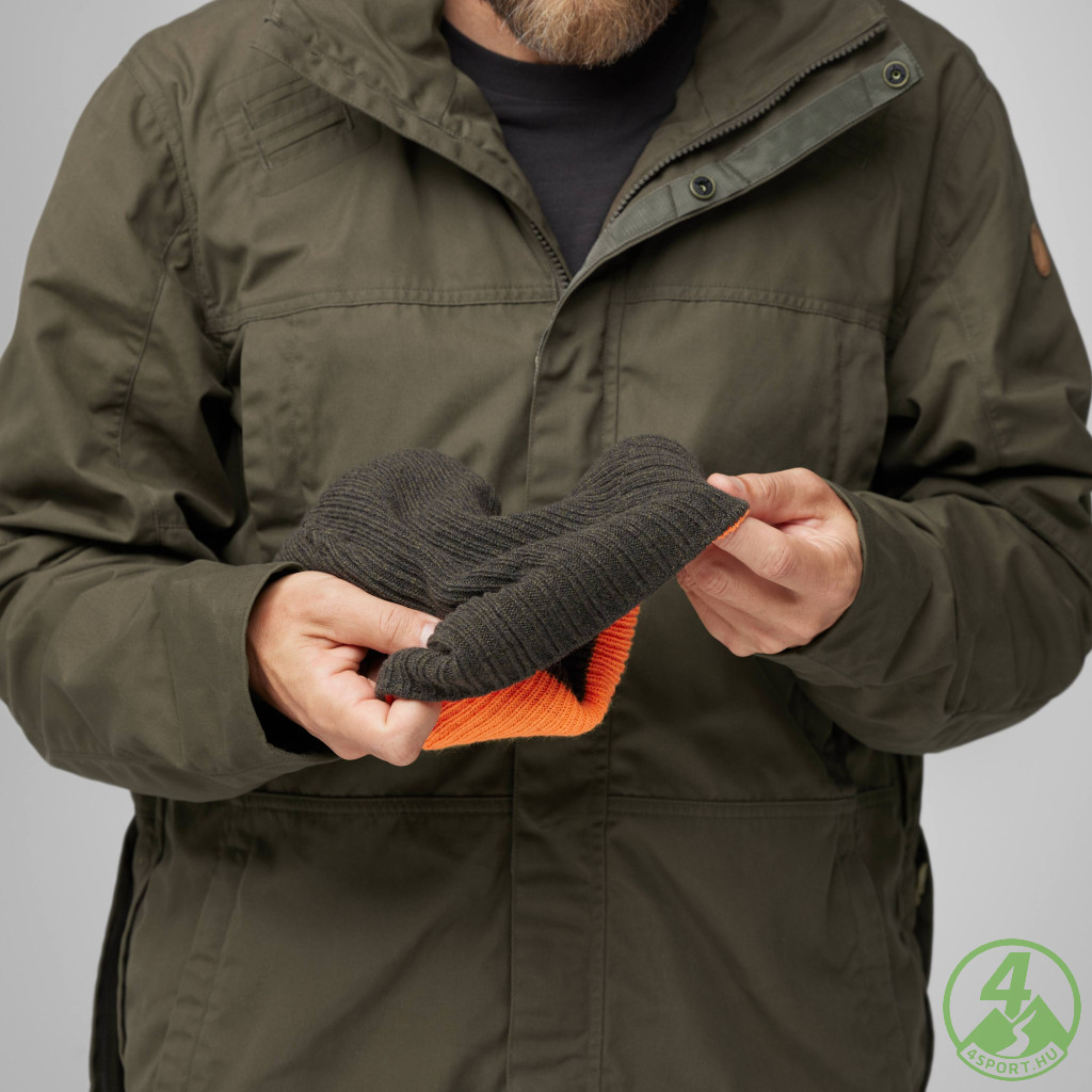 A Sörmland Reversible Beanie egy praktikus, kétoldalas sapka, amelyet kifejezetten vadászathoz és outdoor használatra terveztek. A puha merinógyapjú és akril keveréke kiváló hőszigetelést biztosít, még nedves körülmények között is. Az egyik oldal egyszínű, míg a másik biztonsági narancsszínű visszahajtással rendelkezik – így könnyedén alkalmazkodik a terephez és a láthatósági igényekhez. A bordázott kötés és a kis bőr logó diszkrét, klasszikus Fjällräven megjelenést kölcsönöz. PFAS-mentes gyártásának köszönhetően környezetbarát választás is.